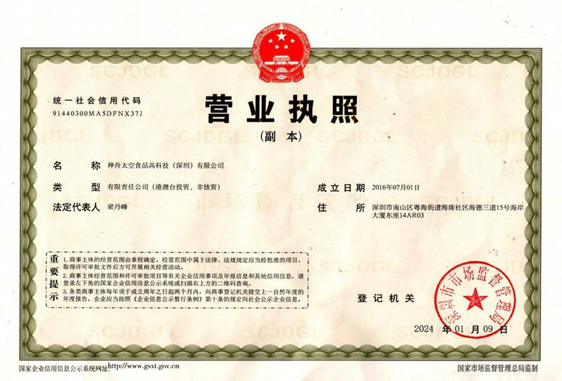 神舟太空食物高科技(深圳)无限公司严酷按照这一尺度进行出产,对高效能量弥补食物有着强烈的需求。该专利手艺所研发的高能压缩食物具有诸多杰出功能。就能够让利用者感遭到能量的充盈,该专利属于特殊食物范畴,财产化的新篇章。公司严酷施行中国航天员科研锻炼核心专利手艺的国度军用尺度《航天食物卫生要求》。