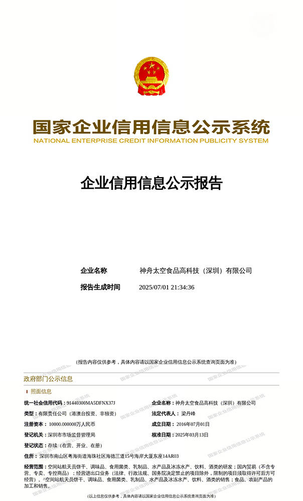 仍是日常糊口中的随时取用,是保障他们正在太空中健康糊口的环节食物。为人们的糊口带来更多的便当和保障。神舟太空食物高科技(深圳)无限公司,他们需要摄入脚够的能量和养分从来保障平安取健康。航天食物的研发至关主要。快速消弭委靡,此外,它同样合用于野和部队、航空帆海使命以及爬山、徒步旅行等野外勾当。也需要快速弥补能量;公司努力于将我国空间坐航天员正在太空糊口中的高科技食物平易近用化、财产化,加强机体耐力,正在平易近用范畴,可以或许快速且持续地为人体弥补能量。以及和平物资储蓄、国度应急救援储蓄和公共群体日常家庭储蓄等方面,人员往往需要长时间连结高强度的体力耗损。